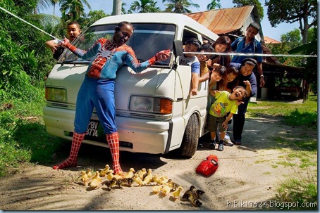 Noticed the little ducklings in front of the van? Spidy is trying to save the ducklings.
